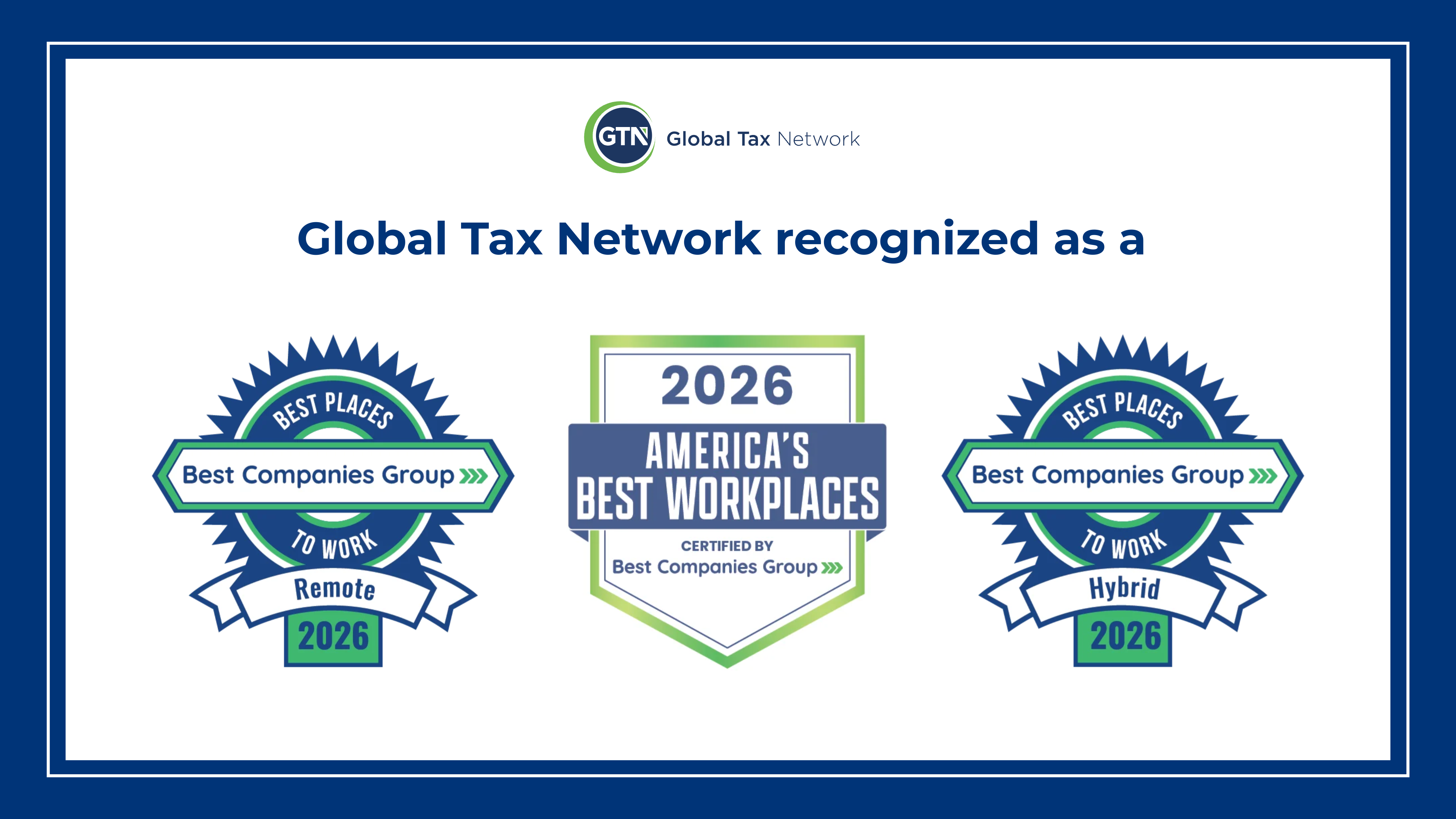Celebrating a people-first culture built on delivering exceptional experiences MINNEAPOLIS, Minn., January 8, 2026—Global Tax Network (GTN), has been named as one of the 2026 Best Remote and Hybrid Workplaces in America and as one of America’s Best Workplaces by Best Companies Group.